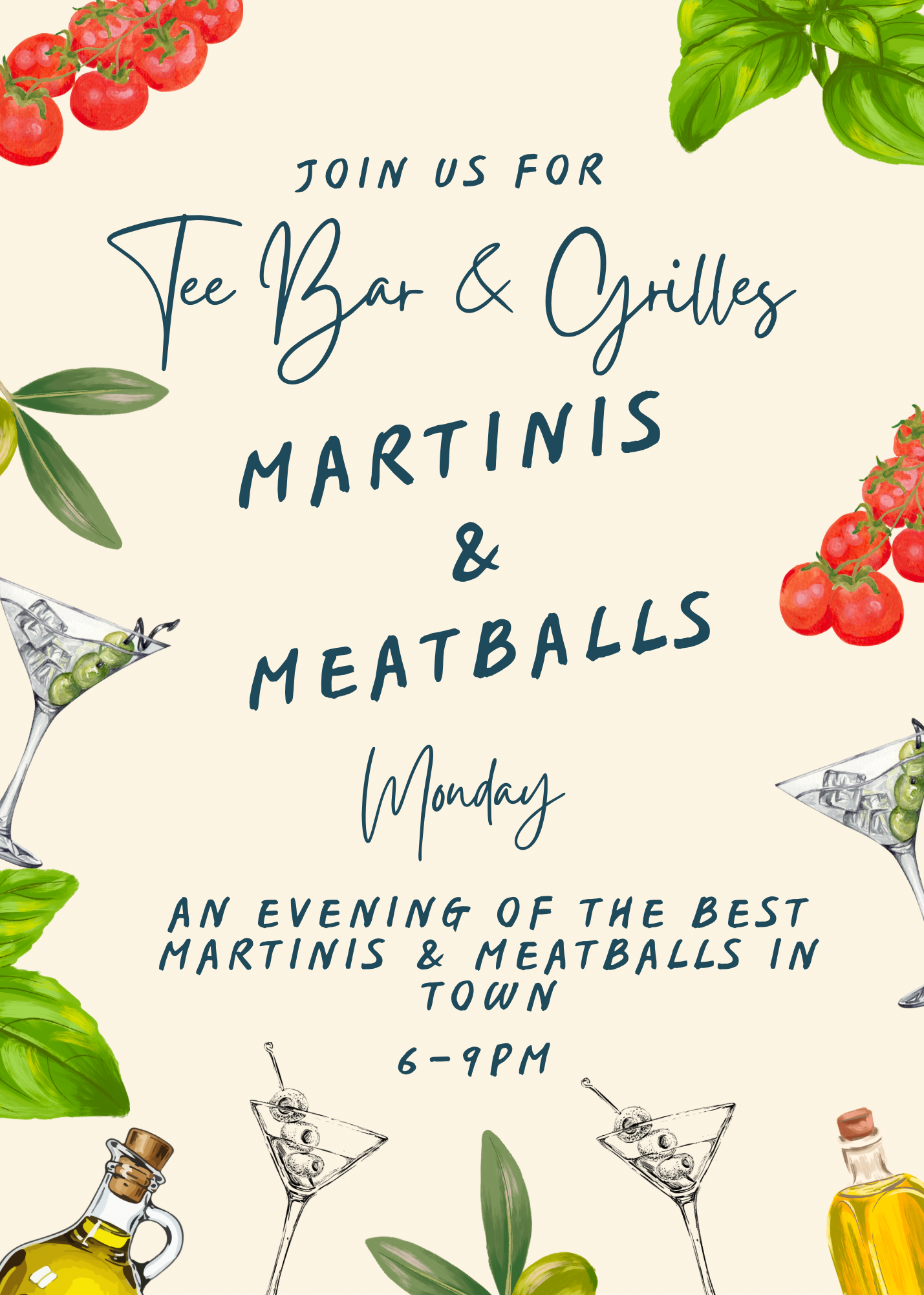 Mondays are for Martini & Meatball Night at Tee Bar—swing by for the best martinis and homemade meatballs in town, great vibes, and even better company!