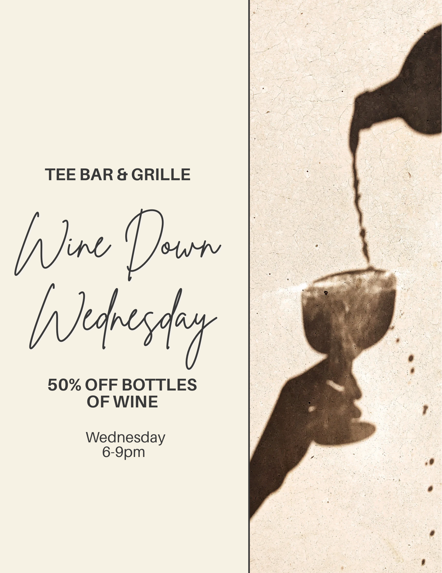 Unwind with Wine Bar Wednesdays at Tee Bar & Grille — enjoy 50% off all bottles of wine and make midweek feel like the weekend!